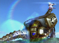 Thundersaurus Megazord flies upward, raising its glowing and spinning tail-arm, then jabs it forth. |