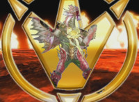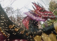 The Rangers bring their special weapons together and create the Super Z-Rex Blaster (with both Brachio Staff and White Dragon Sword). The five Rangers brace around the Super Z-Rex Blaster, aimed at Ruby Dragon, who reacts. Black speaks, as does White, then push in on Red, as he pulls the trigger, and fires the Super Z-Rex Blaster at the monster, trapping him within a Dino Thunder symbol, that then explodes brightly. The Rangers break off, Red holding the Super Z-Rex Blaster, as they turn and pose as Ruby Dragon crackles, collapses, and explodes massively. |