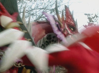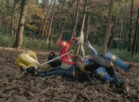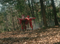 Red rushes forth, grabs Ruby Dragon, drags him into the woods, then flings him into a tree. |