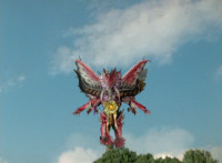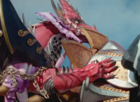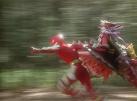 Ruby Dragon grabs Dino Stegazord's back, keeping it from striking him, then releases, dropping Dino Stegazord to the ground, shaking up the cockpit. |