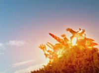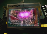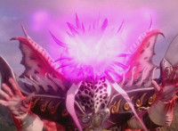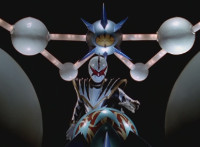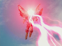 A ball rises up and causes stormclouds to appear in the blue sky, raining suddenly, the purple glowing mass rises up and forms into a gigantic body with a flash of light. |