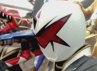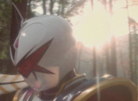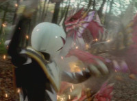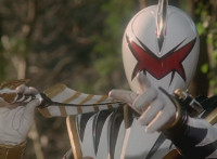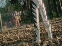 White stops a distance away from Ruby Dragon and the Rangers, talking while holding his sword over his shoulder. Zoom in on Red reacting. |