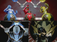 Black flips over and kicks Ruby Dragon, sparking him, before Blue & Yellow leap up and bounce off Black's shoulders, striking their hands forth. |