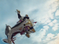 Recycled, per source; trimmed and sped-up; cuts follow-ups of White in cockit, then Thundersuaurs formating shots. |