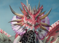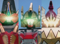 Zoom in on Triassic, zoom in on Black, zoom in on White, all three Megazords' eyes glow, as the three Megazords suddenly begin to glow. Ruby Dragon watches, as they all fire their golden energy upward at him, causing him to crackle, burst, and disintegrate, raining down chunks on the battlefield. Mezodon Megazord, Thundersaurus Megazord, and Dino Stegazord pose triumphantly side by side. |