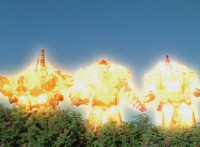 Blue, Triassic, and Yellow in the Thundersaurus cockpit gesture. The three Megazords pose side by side facing the monster, prompting Ruby Dragon to leap up and float up into the sky, where he eyebeam blasts down at the trio, bursting them and shaking all their cockpits. |