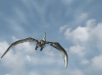 Cuts follow-up of Megazord flying up and jabbing charged tail-arm forth. |