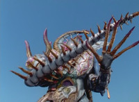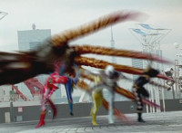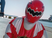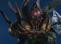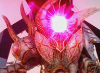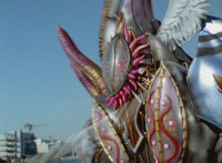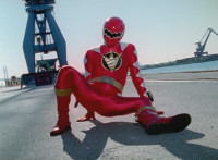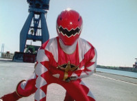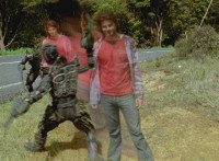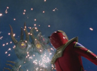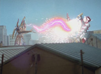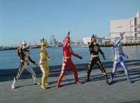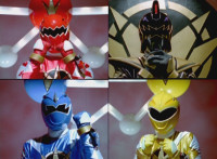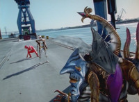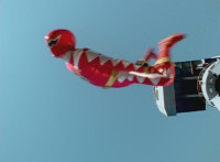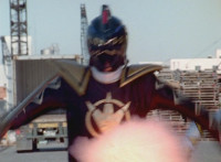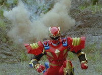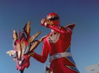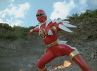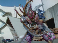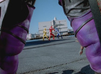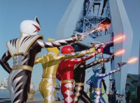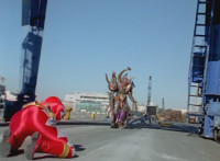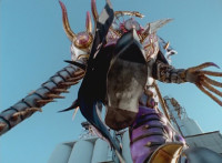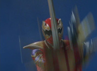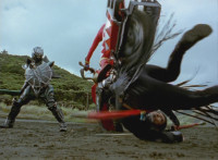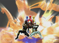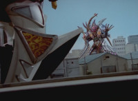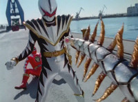 Ugly Monster fries Triassic until he bursts and falls back to Japan... I mean, Earth. He falls to the ground, now just Red Ranger again, as Ugly Monster also lands. Red talks and tries to get up, but fails. Black, Blue, and Yellow charge at the monster, who turns and eyebeam blasts them down. Red reacts and doubles over, Ugly Monster turning back around and extending his centipede arm forth at Red, only for White to drop in between them. |