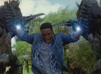 Cuts before zoom in finishes; cuts follow-ups of monster's shoulders talking, then a shot of White touching visor. |