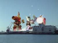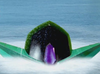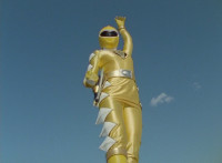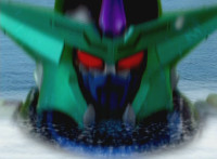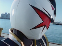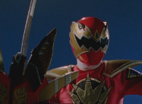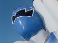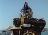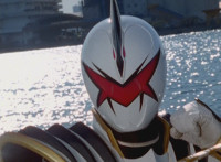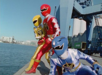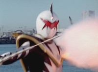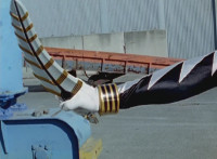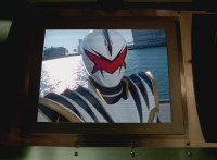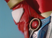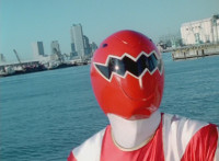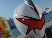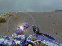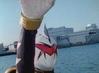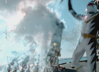 Ugly Monster eyebeam blasts Black & White, bursting them into the sea. The other three Rangers rush over to look for them, but their attention turns instead back to Ugly Monster. Blue speaks, then Red pulls out his Shield of Triumph, which gets infused with energies. |