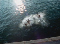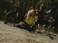 Altered to fit monitor; cuts follow-ups of something rising from the sea, the Rangers turning to look, Ugly Monster recovers and strangles White. |