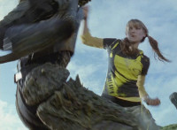 Yellow kicks a Tyrannodrone, flips over and lands gracefully. |