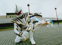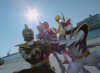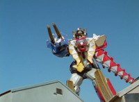 The Rangers bring their special weapons together and create the Super Z-Rex Blaster (with both Brachio Staff and White Dragon Sword). |