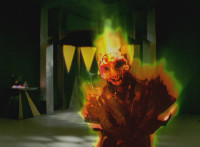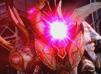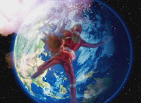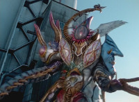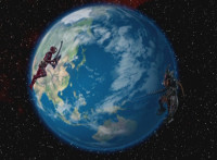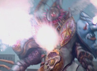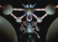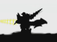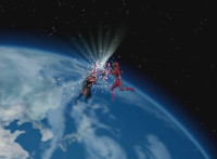 Triassic raises a fist, then turns around and teleports himself and Ugly Monster up into space, floating just above the Earth. There, they clash blades sparkily, Triassic sparkily slashing the monster, and tries to do so again, only for Ugly to grab the blade. |
