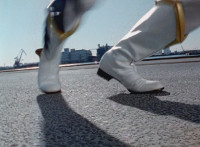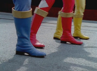 Ugly Monster vanishes, Red reacts, then the monster's giant hand swipes past the five Rangers, flipping them over. Red recovers and looks upward, seeing the giant Ugly Monster about to stomp on them. The Rangers leap out from underfoot, then fire their lasers up at the monster, who sparks, then teleports away, leaving Red glancing about. |