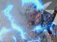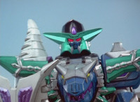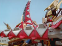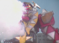 Mezodon & Thundersaurus pose battle ready, as Replicant Zord slowly approaches, so both Megazord charge forth, Thundersaurus getting sparkily slashed by the evil Zord. |