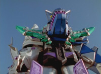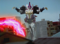 Thundersaurus flies past Replicant Zord, hitting it with its glowing tail-arm, causing it to crackle. Black speaks, then Mezodon Megazord charges up a hatchet attack, fling the energy slashes at Replicant Zord, bursting it. |