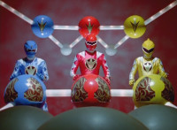 Blue uses his Tricera Shield on multiple surrounding Tyrannodrones. |