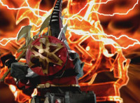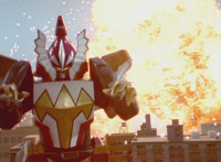 The helmet locks onto the head, as Thundersaurus Megazord floats completed in front of an explosion. |