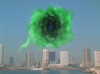 A giant invisiportal opens up in the sky above the city, Zelzord emerging from within it. |