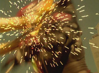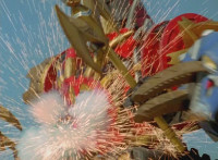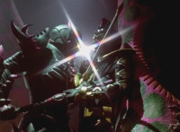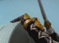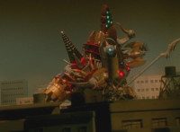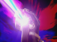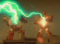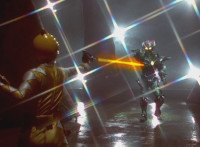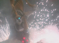 Cuts follow-ups of Megazord stabbing Zelzord sparkily in the neck. |