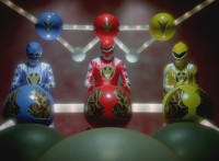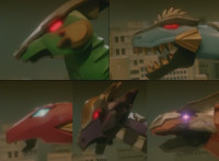 Recycled, per source; cuts follow-ups of each Zord's puppet head roaring then the Rangers leaping up. |