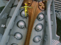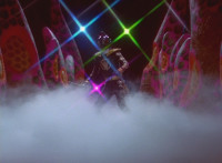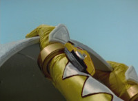 Zelzord zaps Thundersaurus with green electricity, causing it to stagger back and burst, shaking up the cockpit. Black falls sparking, overwhelmed by Triptoids. Yellow talks to her teammates, then leaves the cockpit, Red reacting. Yellow leaps over to Zelzord's skirt, and slides into the entry tube. |