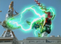 Zelzord wraps a green energy rope around Thundersaurus, ensnaring it. |