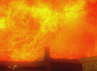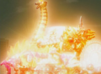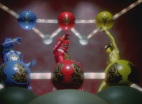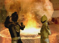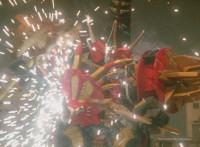 Mezodon Megazord & Thundersaurus Megazord grab Zelzord and give it a big ol' hug, causing all three to burst, the cockpits erupting with sparks around Red & Blue. Crackling occurs, the trio glow, then collapse onto each other and explode enormously. Black & Yellow react. |