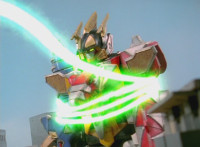 Mezodon Megazord readies weapons and charges at Zelzord, who fires, bursting but not stopping Mezodon, which sparkily slashes Zelzord until it turns around. Mezodon then grabs Zelzord from behind. |
