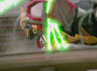 Cuts prior footage of Yellow fighting Zeltrax; Split to fit US shot of Zeltrax between. |