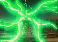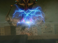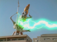 Zelzord fires electricity blasts at Mezodon & Thundersaurus, bursting them both. |