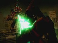 Cuts follow-ups of Zelzord sparkily striking Megazords; then cuts later follow-ups of more fighting and finisher attacks used on Zelzord to no avail. |