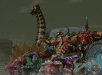 The full armada of DinoThunder Zords, standing together (sans White Drago, who had a prior engagement), begin to glow, the light blinding Zelzord. |