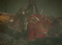 Thundersaurus's tail-arm crashes into Zelzord, cutting explosively between Zeltrax and his prey, causing him to fall over. |