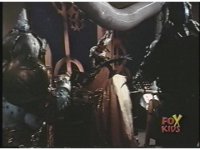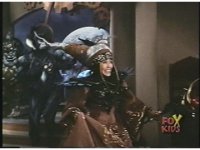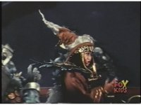 Zoom out from US Goldar's talking face on dark balcony, as he jerks his arms in the air, then slashes sword across the screen then back again, before arm jerking some more. |