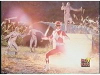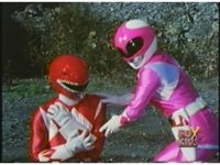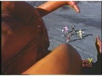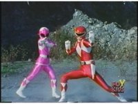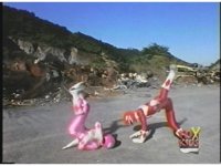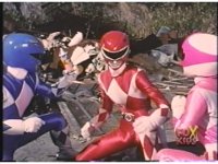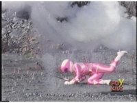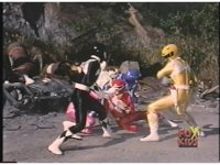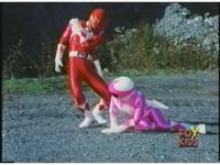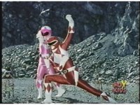 Pink & Red Rangers are thrown out from under the camera, rolling over toward the junkyard area of the quarry. |