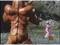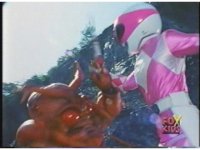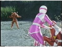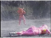 Fighting Flea, back to us, continues to taunt Pink Ranger in distance, who finally gets up off the ground and aims Blade his way. |