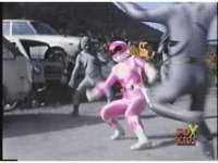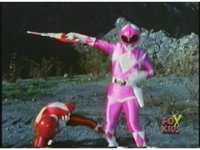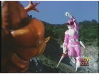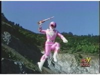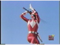 Pink Ranger, jumping toward us, slashes Blade at the screen as shot zooms in. |
