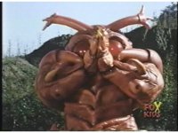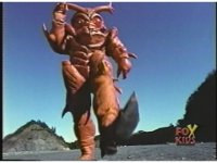 Megazord tromps forth with wide steps in upward angle in quarry, until reaching Fighting Flea, they lock in a hold, before turning to the side and breaking free. Flea kicks, Mega blocks, then punches, but it's blocked. They grab each other in another hold, only to break off once more, each pushing back away and posing battle ready. |