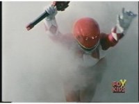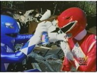 Red Ranger, on top of Tyrannosaurus' head, poses a little, then drops inside. |