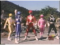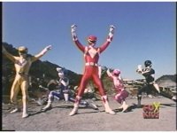 Zoom out from Red, as all five Rangers in cockpit raise right arms and make slashing downward motion. |