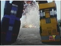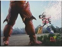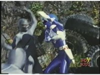 Fighting Flea kicks at Megazord, which blocks, then sparkily punches back. Mega smacks at Flea, who dodges and rolls to our right, gets up and strikes to lunge, but Mega sparkily strikes Flea against, knocking him off. |