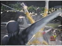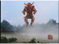 Pterodactyl Dinozord flies out of the smoking volcano and heads for the trees, never getting even close to them. |