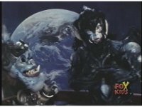 Backs to the cardboard Earth cut-out, Squatt & Baboo look at one another, then forth, appearing confused. |