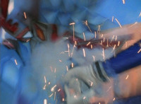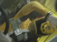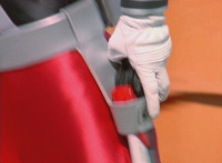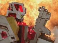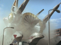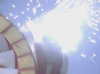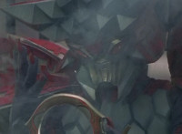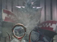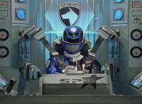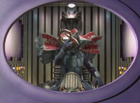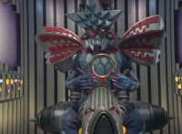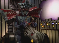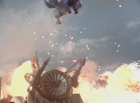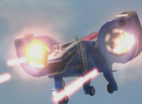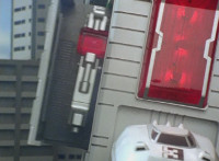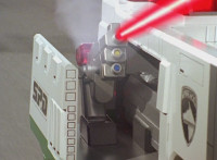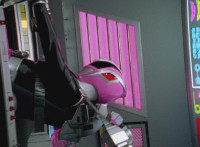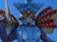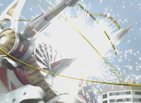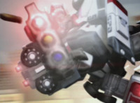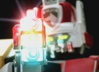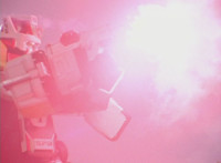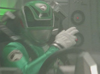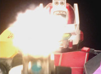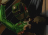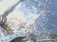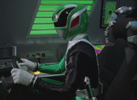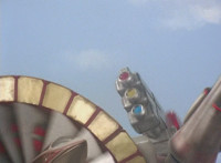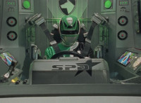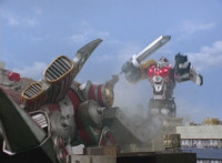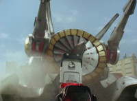 Praxis turns, then presses a button, causing the fan to spin, and debris to shoot out of the vents in the Robot's back end. Delta Squad Megazord gets overwhelmed by the debris, losing grip on its Blaster, which falls onto Drill Robot, before the Megazord topples over. Green in his cockpit gestures and speaks, popping open the leg compartment with the Saber within. The Megazord pulls it out, Yellow rights her cockpit up, and the Megazord stands back up, before quickly leaping up and flipping over Drill Robot, sparkily slashing off its main drilltip, snagging its Blaster back, and landing on the other side. Praxis sparks in the shaking and smoking cockpit, and when it stops, he presses three buttons on the controls, before leaping out to safety. |