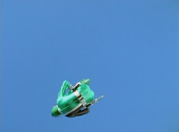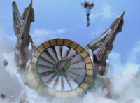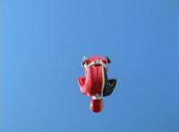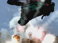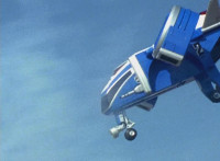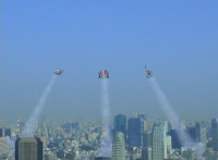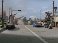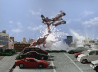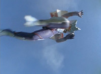 Cuts prior shot of four in their cockpits; cuts follow-ups of Red running off into the city. |