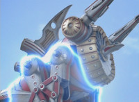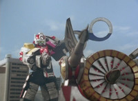 Delta Squad Megazord charges up its Mega Blaster, its tri-colored barrels lighting up colorfully. Numbered colored slices slide in from reverse order of each Ranger in their cockpit, speaking, then aiming forth. Delta Squad Megazord fires its Blaster, blasting all around Drill Robot as it continues to roll forth, until it finally explodes massively. |