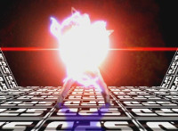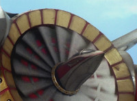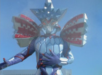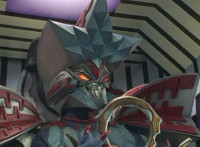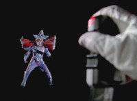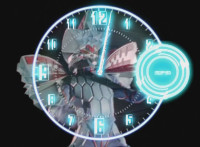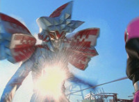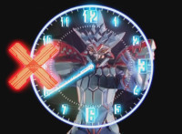 Praxis recovers, just as Red jumpkicks in and knocks him away. As he lands, the Rangers regroup, Red reholstering his Blasters, and speaking forth, before pulling out his Delta Morpher and holding it forth at the recovering Praxis, before opening it up. It flashes with energy, changing the backdrop to black, Praxis standing in front of a clockface and two alternating X or O symbols. Push in on Red holding his Morpher forth as the symbols blink on it. Praxis is finally judged guilty with a big red X. The other four motion their arms, as Red connects his two Delta Blasters into Combo Mode, aims it at Praxis, and speaks, before charging it up and firing it down an SPD logo corridor, bursting Praxis. Now back in the real world, Praxis crackles, collapses, and explodes massively. |
