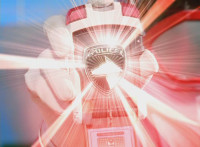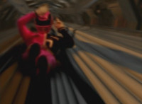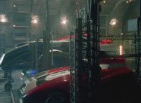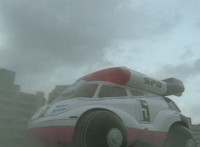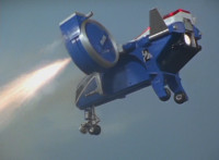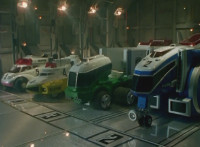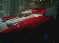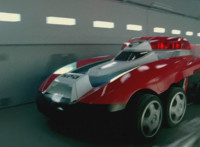 Red slides down the entry tube into Delta Runner 1, landing in the cockpit, inserting his Delta Morpher into the slot and pressing the button on it, pressing down on the pedal, the display screen lights up. Red shifts gear, the wheels spin, Red nod-talks, presses down on the pedal some more, then Delta Runner 1 speeds out of the hangar. |